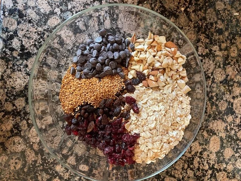 Next, throw the oats, seeds, and fix-ins of your choosing to the nuts!