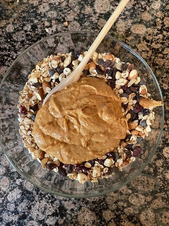 Add the (seriously delicious) nut butter mixture to the nuts/oats and mix well.